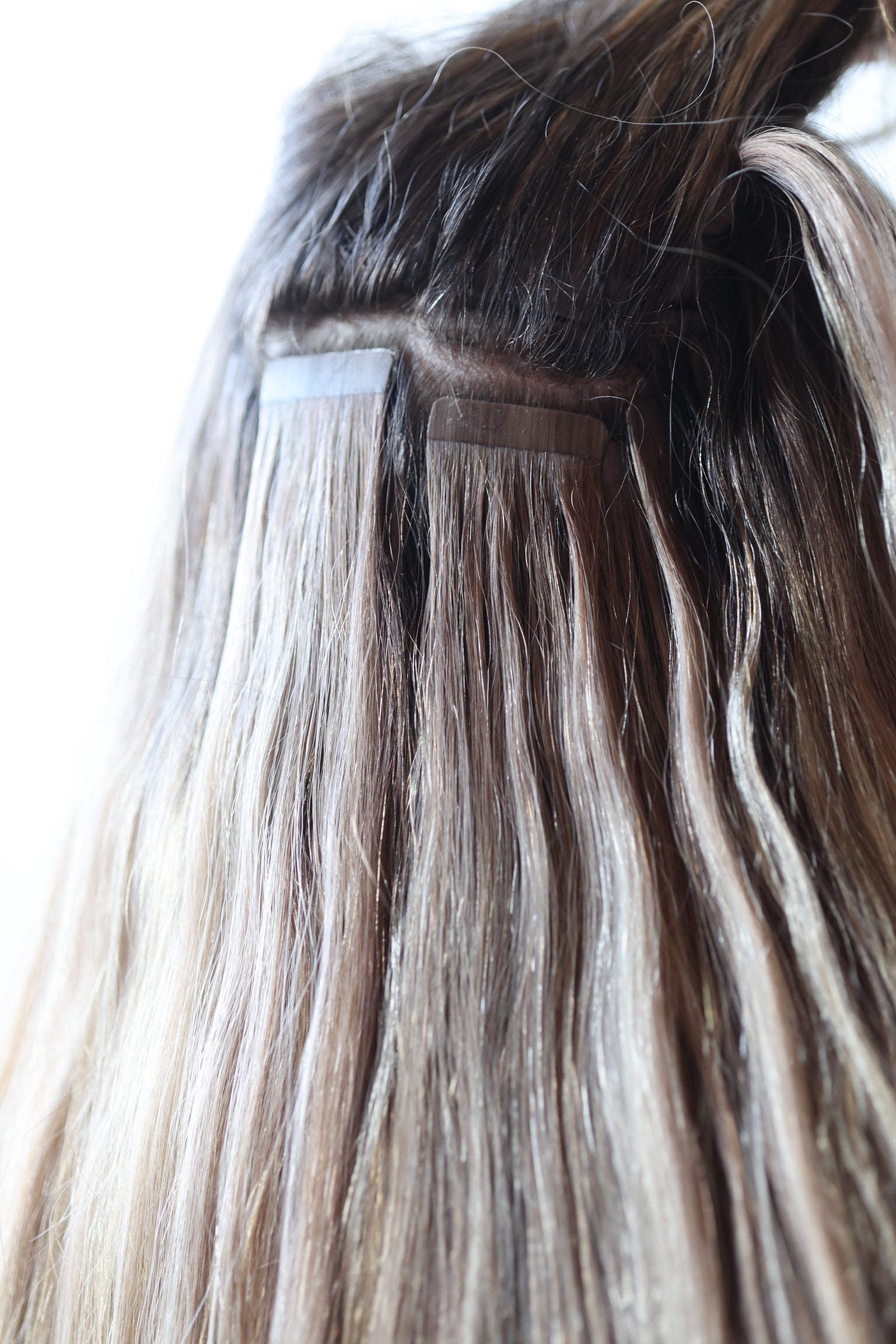 Tape-in extensions are pre-taped, ultra-flat panels of hair that are sandwiched with your natural hair in between. They offer a fast and easy application process with little damage when applied and removed correctly. Tape-ins are perfect for those who want quick volume, length, or pops of color.